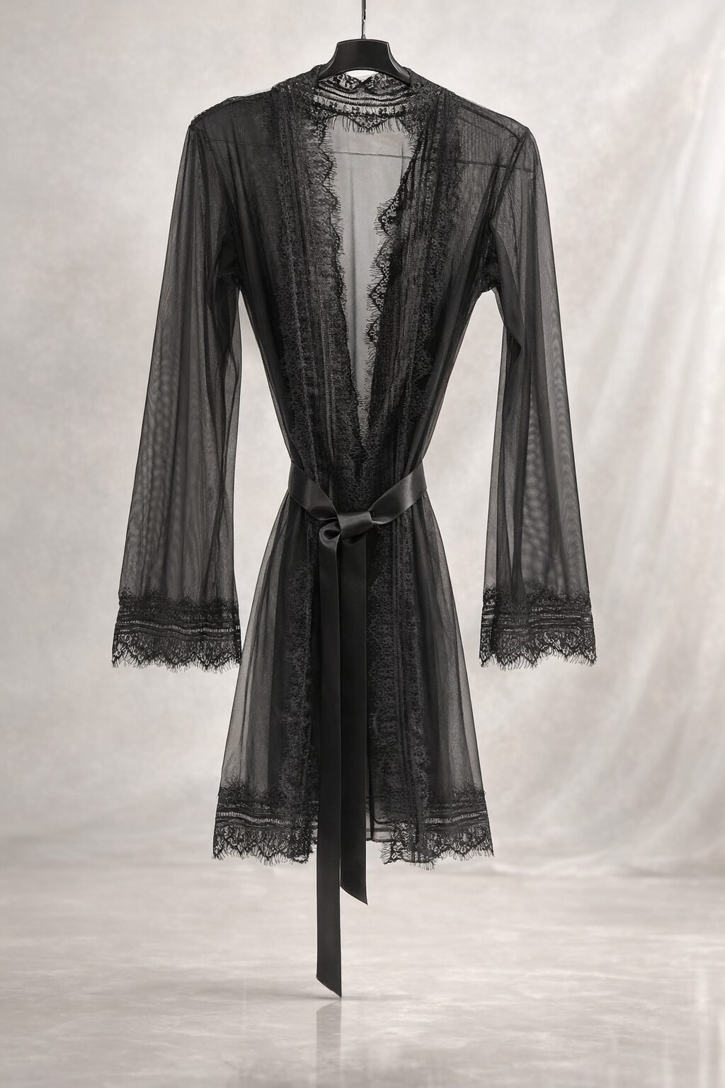 Bata femenina elaborada en tul suave y ligero, una tela translúcida que aporta un efecto delicado y sensual sobre la piel. Su diseño se caracteriza por una caída fluida y elegante, que se adapta suavemente al cuerpo permitiendo libertad de movimiento y un estilo sofisticado.Esta bata está disponible en tres tonos clásicos y versátiles: negro, rojo y blanco, colores que resaltan la transparencia del tul y la delicadeza del encaje, adaptándose a diferentes estilos y momentos.